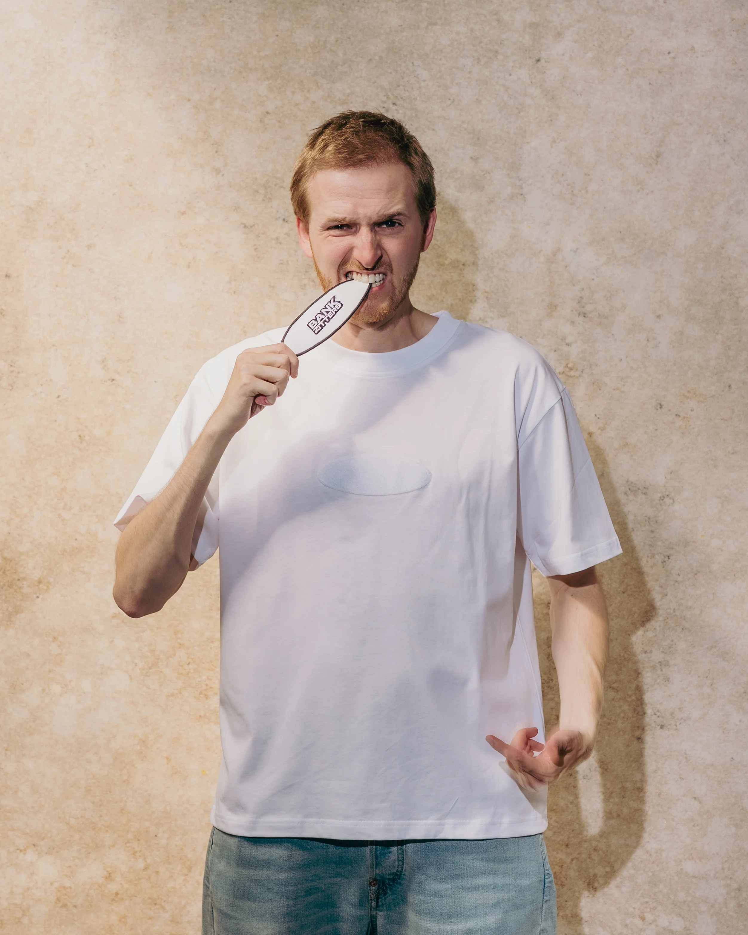 Ons patch-systeem maar dan op een shirt. Voorop de klassieke Bankzitters-patch, achterop een BZ die er niet om liegt. Business in the front, party in the back.